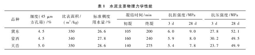 水泥备选了冀东、蒙西、天浩 3 个厂家 P.042.5 级普通硅酸盐水泥,其主要物理力学性能如表 1 所示。粉煤灰采用达拉特电厂(华宇)粉煤灰。细骨料为细度模数 2.42 的中砂,含泥量为 3% 。粗骨料为 5.0-31.5mm 连续级配碎石。水为普通自来水。减水剂为包头钢鹿建材公司聚狻酸减水剂,减水率 35% 。脱模剂为四川某公司生产的脱模剂 T-1, 青岛某公司生产的脱模剂 T-2, 上海某公司生产的脱模剂 T-3, 液压油 T-4 。