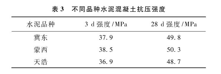 由表 3 看出, 3 种水泥配制的混凝土 3d 强度接近、 28d 的强度接近,均能满足工程要求。从图 1 可以看出, 3 种水泥对混凝上表面气泡的影响不大,但蒙西水泥效果相对好,所以该工程优选蒙西水泥,试验也采用蒙西水泥。