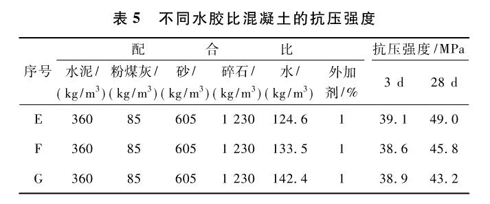 选用蒙西水泥,涂脱模剂T-1, 按表5 配合比进行试验。调整混凝土水胶比,研究水胶比对混凝土表面气泡的影响,结果见图3。不同水胶比混凝土的抗压强度见表5