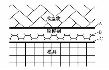 涂刷 T-1 脱模剂能有效解决表面气泡问题的主要原因: ① 脱模剂是一种水性聚合物,能够均匀地涂刷在模板表面,降低混凝土与模板之间的界面结合力,使气泡容易逸出破灭,减少混凝土表面气泡数量; ② T-1 脱模剂中含有一定的消泡成分,有利于气泡的破灭或向内部移动,减小混凝土表面气泡直径,并降低气泡数量; ③ T-1 脱模剂中含有一定的缓凝组分,可延长混凝土表面浆体的凝结时间,浆体的自身重力作用使生成的气泡破灭或向内部移动,减少混凝土表面气泡的数量。 ④ 脱模剂附着于成型物和模具之间直接起到隔离作(图 5) ,脱模时能在 B 面剥离,使得脱模效果优 [6-7] ,有利于改善混凝土表观质量 。