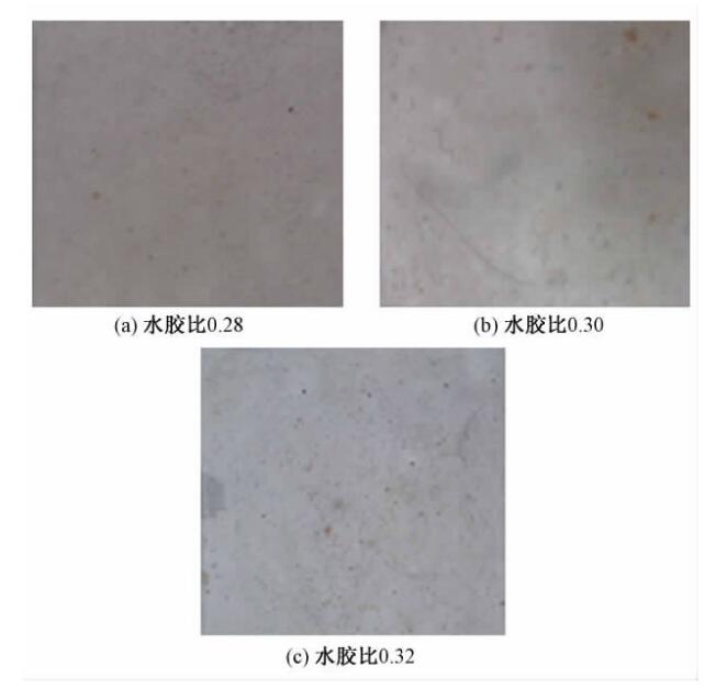 从图3可以看出,随水胶比增大,混凝土表观质拭变差;随水胶比的减小,试块表面气泡减少,对混凝土外观质从改善作用较明显。由表5可知,随水胶比的减小,强度增大但过小的水胶比可能会影响混凝土的工作性能,增大混凝土的收缩,经济方面也不合适。由此可见,水胶比是影响混凝土表面气泡的一个重要因素。水胶比对混凝土平均气泡直径及比表面积、气泡的孔径分布等特征会产生显著的影响【2-5】。其主要原因是随疗用水量的降低,胶材用量相对增加,胶凝材料水化所悄耗的用水扯增加,使混凝土中自由水降低,从而有利于减少表面气泡的生成。